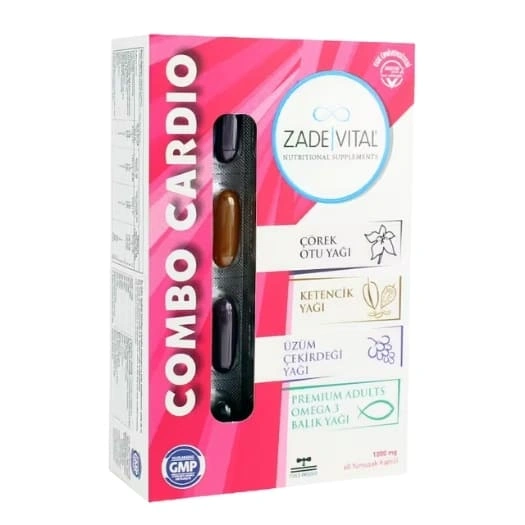 Zade Vital Combo Cardio هو مكمل غذائي مكوّن من مجموعة مختارة من الزيوت الطبيعية وأحماض أوميغا-3 الدهنية، مصمم لدعم النظام الغذائي اليومي للبالغين. يتضمن هذا المنتج 4 أنواع مختلفة من الزيوت، بما في ذلك زيت السمك الغني بأحماض أوميغا-3 (EPA وDHA) إلى جانب زيت الحبة السوداء، زيت بذور الكتان، وزيت بذور العنب، جميعها معبّأة في كبسولات سهلة الاستخدام لحياة أكثر راحة وتنظيمًا في الاستهلاك.