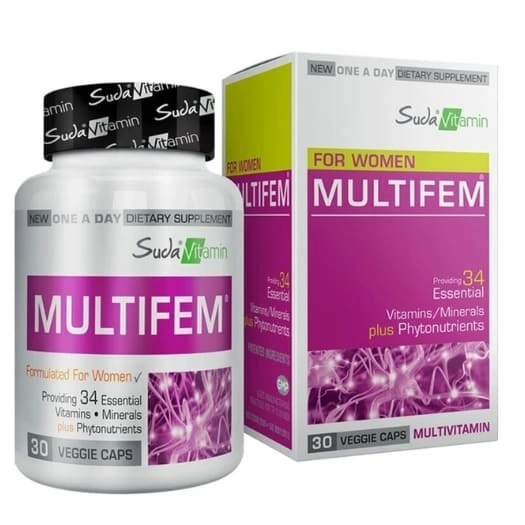 Suda Vitamin MultiFem هو مكمل غذائي مُخصص للنساء، يحتوي على تركيبة من الفيتامينات والمعادن المختارة لدعم الاحتياجات الغذائية اليومية، ويأتي على شكل كبسولات نباتية سهلة الاستخدام.