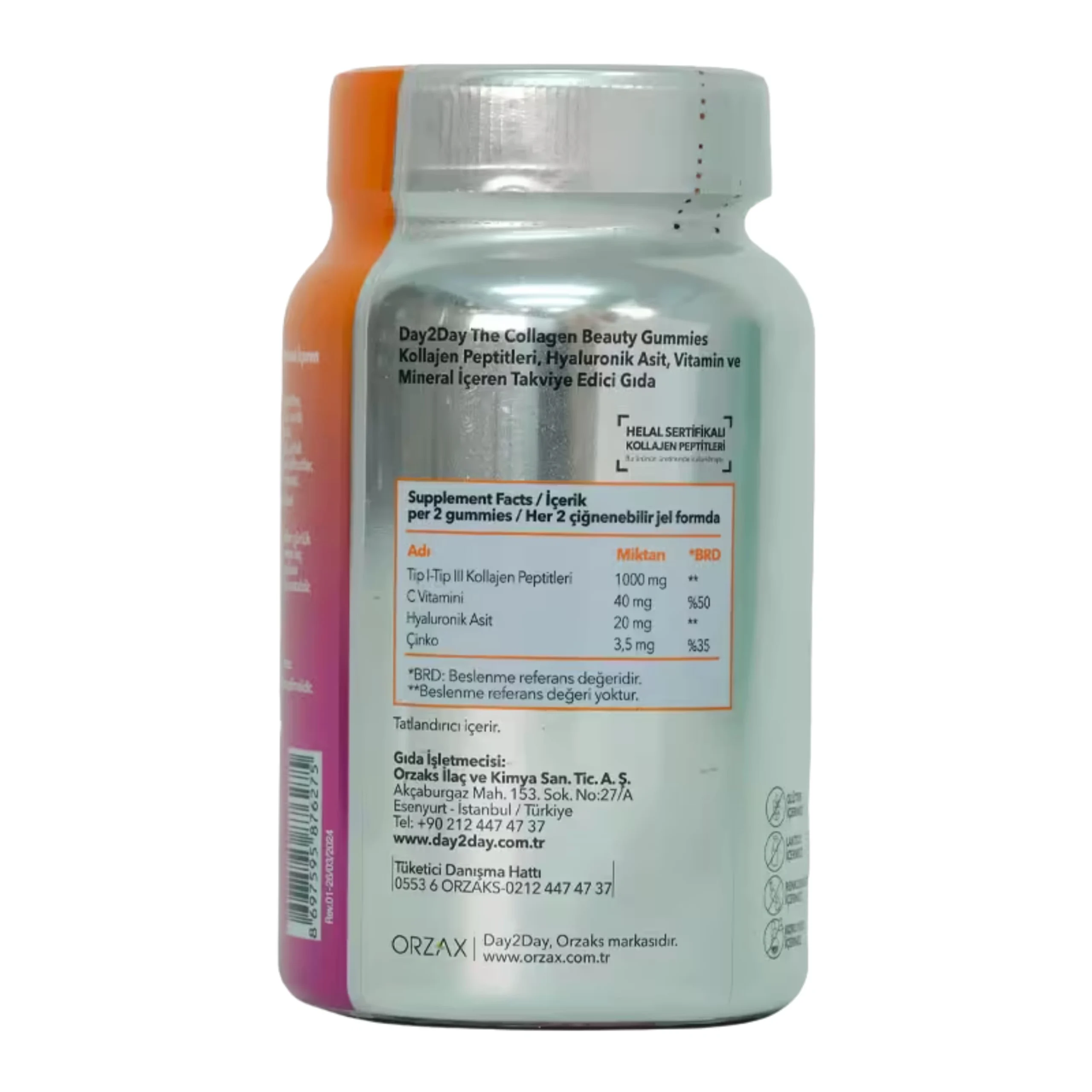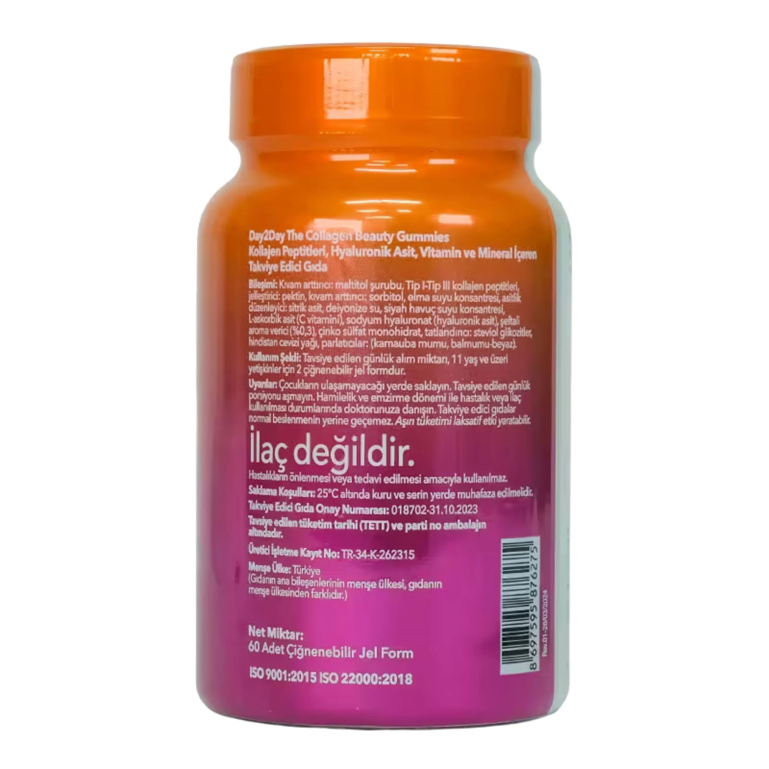 كما أن Day2Day The Collagen Beauty Gummies تم تطويره وإنتاجه في أول منشأة في تركيا مخصصة لتقنية تصنيع المكملات الغذائية في شكل جيلي قابل للمضغ، مما يضمن جودة عالية ومعايير إنتاج متقدمة.