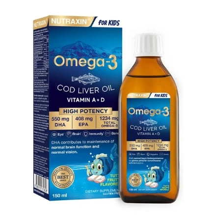 نوتراكسين أوميغا 3 للأطفال هو مكمل غذائي مُخصص لدعم النظام الغذائي اليومي للأطفال، بتركيبة متوازنة تحتوي على أحماض أوميغا-3 الدهنية الأساسية DHA وEPA بالإضافة إلى فيتامينات A وD وE.