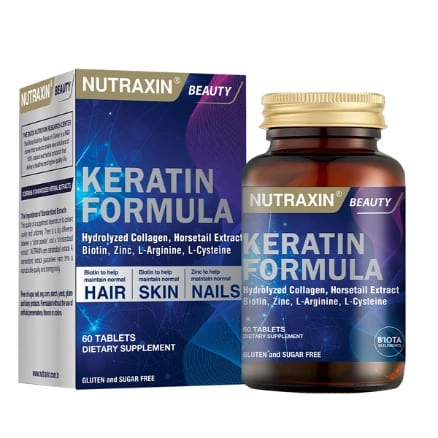 نوتراكسين تركيبة الكيراتين هو مكمل غذائي متكامل تم تطويره خصيصًا لدعم العناية اليومية بـ الشعر، الأظافر والبشرة، حيث يجمع بين البيوتين، الزنك، فيتامينات مجموعة B بالإضافة إلى مركب MSM الغني بالكبريت، مع مجموعة مختارة من المستخلصات النباتية.