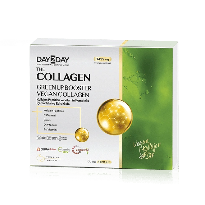 Day2Day Green Up Booster هو مكمل غذائي نباتي 100% يحتوي على 1425 mg من Collagem®-V (كولاجين نباتي ببتيد)، مدعّم بفيتامين C، الزنك، فيتامين B12 الفعّال، وفيتامين D النباتي. يأتي بنكهة التفاح الأخضر لتجربة منعشة وسهلة الاستخدام لدعم البشرة، المناعة والطاقة.
